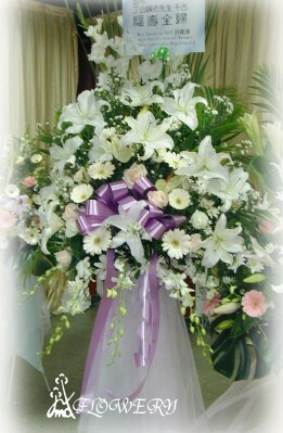 主要花材:香水百合、白玫、太陽花、白孔雀、白石斛蘭
