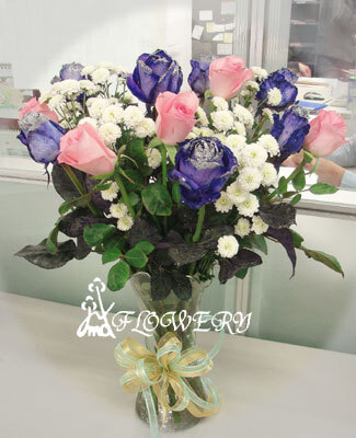 主要花材:藍玫,粉玫,法國小菊及綠色配材