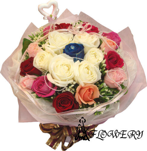 浪漫花束促銷fa9741─21朵複色玫瑰(中間1朵藍玫)