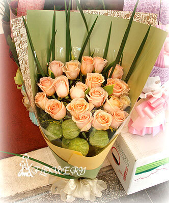主要花材:香檳玫瑰花20朵及其他配材