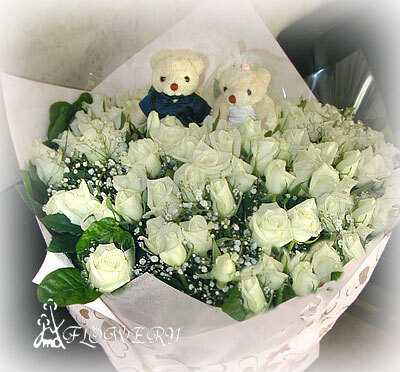 主要花材:白玫或粉玫瑰99朵,滿天星,茉莉花,新郎新娘小熊1對
