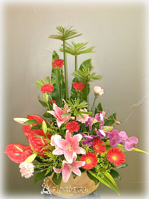 主要花材:玫瑰花6朵,火鶴花,蝴蝶蘭,太陽花,粉百合...等和其他配材