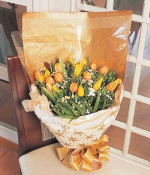TFTD313-06-金色年華 主要花材:鬱金香2種顏色共24朵 朵數花語:24朵(思思念念) 尺寸:約:30X40X50 (配材如遇市場缺貨將以同系列配材替代以達相同效果!)