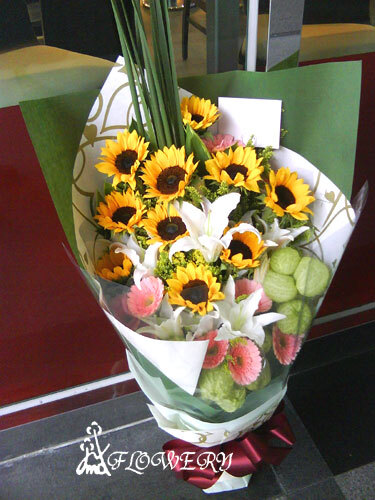 主要花材:向日葵,百合,太陽花,唐棉與綠色配材