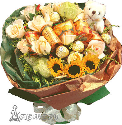 花材:玫瑰花,向日葵,金莎巧克力,小熊及綠色配材