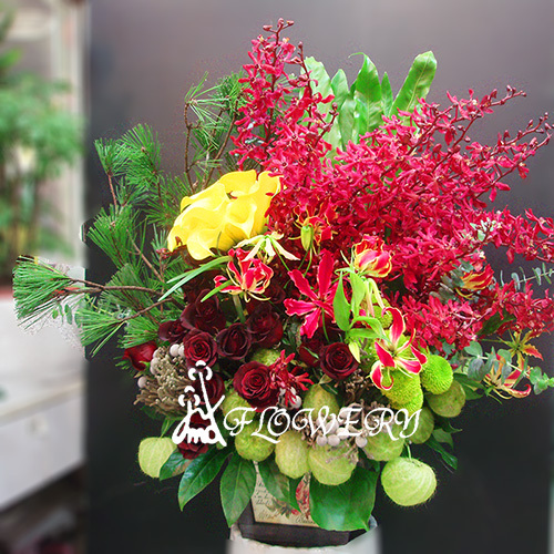 主要花材:紅蘭花.玫瑰花.乒乓菊,唐棉.海芋,火焰百合賀春飾品及其他綠色葉材
